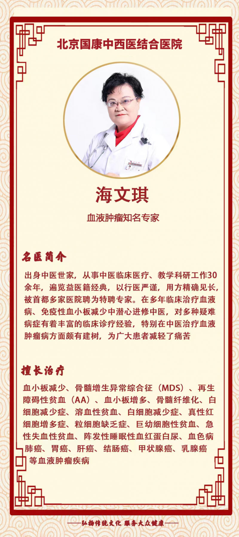 这位张大姐患骨髓纤维化伴血小板升高三年,每次来诊都紧张得手心冒汗。海文琪主任总是先扶她坐稳,再慢慢卷起她的袖子 —— 不是猛地一掀,而是像展开易碎的丝绸那样,沿着袖口一寸寸向上卷。“您看,这胳膊上的瘀斑比上次淡多了,” 她边说边用指腹轻轻按了按患者的皮肤,“血小板 620×10⁹/L 虽然还高,但出血倾向在减轻,说明中药调理在起效。”