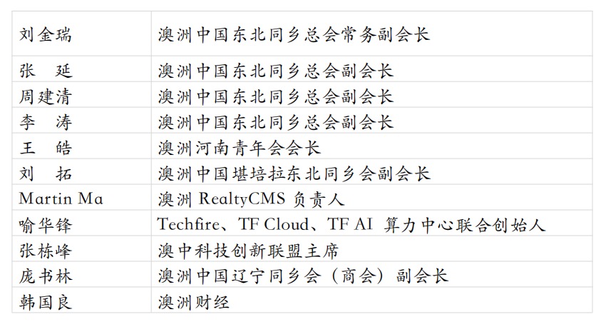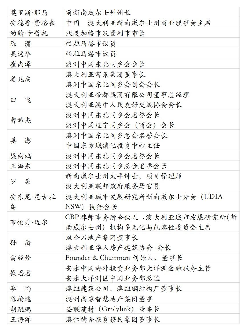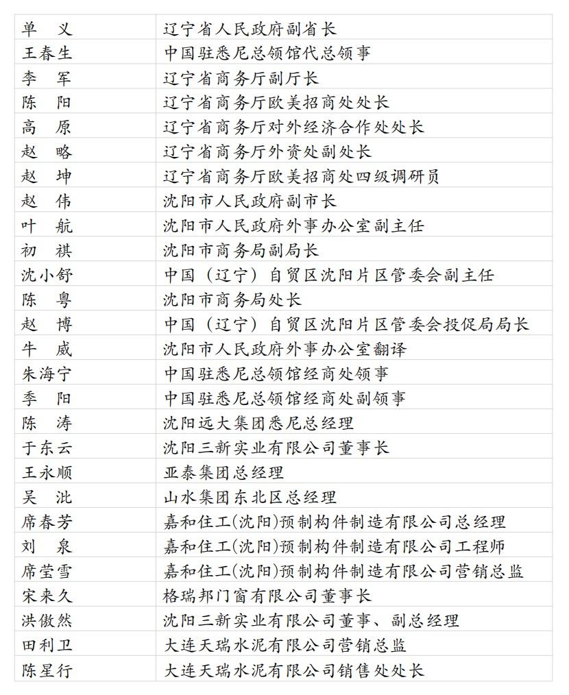 辽宁省人民政府副省长单义率团出席活动,并与澳方政商界代表及澳洲中国东北同乡总会代表举行会谈。中国驻悉尼总领馆代总领事王春生、沈阳市副市长赵伟一同出席。澳洲中国东北同乡总会代表崔尚泽、姜兆庆、田飞、曹希杰、姜澎、任慧等也应邀出席了会谈。