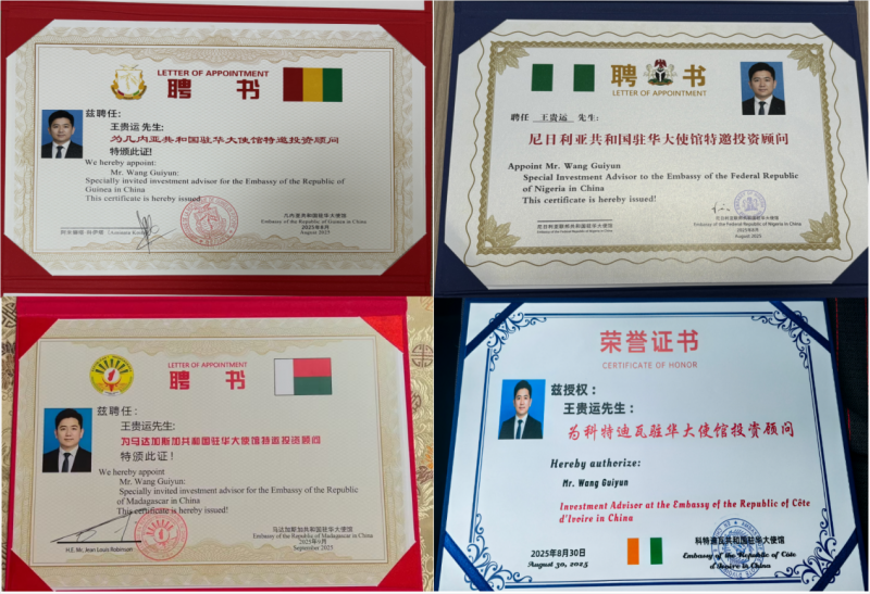 -在全球经济格局深刻调整、中国金融市场不断扩大开放的背景下,香港远景未来投资管理股份有限公司再传喜讯:公司创始人兼董事长王贵运先生,近日正式受聘为几内亚、科特迪瓦、马达加斯加、尼日利亚等多国驻华大使馆特邀投资顾问。