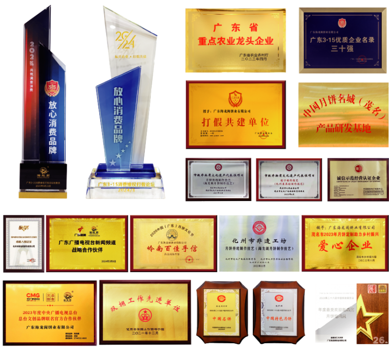荣誉加身,品牌闪耀凭借优质的产品和卓越的品牌公信力,海龙阁收获了众多荣誉。荣获“2024年、2025年广东3·15消费维权打假论坛放心消费品牌”及“广东3·15优质企业名录三十强”、 “广东省五一劳动奖状”、“广东老字号”、“茂名‘信’字号”,入选广东正品好物甄选,成为广东省重点农业龙头企业 。其品牌影响力从粤西延伸至全国,产品不仅畅销国内市场,还逐渐走向国际舞台,向世界展示着中国传统美食的魅力。