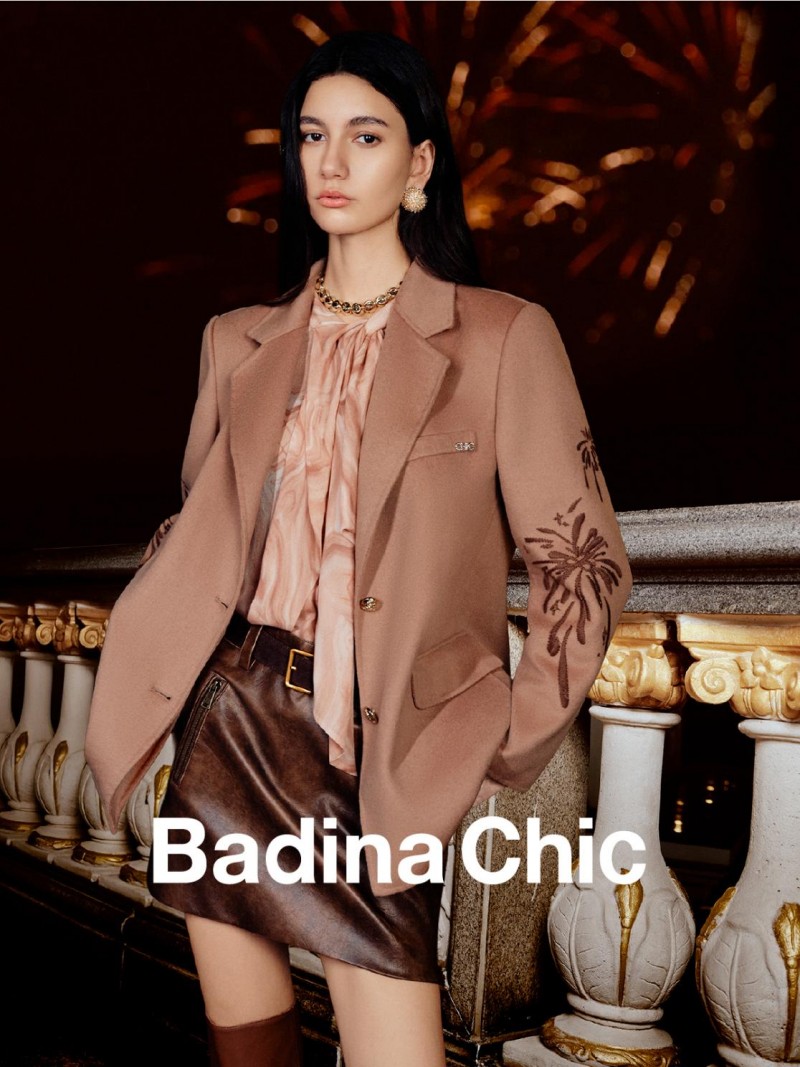 本季,BadinaChic芭蒂娜·绮珂以暖棕、酒红、摩卡、雾霾灰等冬日主色为基调,辅以金属纽扣与复古饰件,在低调间释放高贵气场。经典呢料西装外套被重新演绎,以挺括线条勾勒利落廓形;真丝蝴蝶结衬衫在灯火映衬下流光溢彩,呈现轻盈与力量的和谐共生。