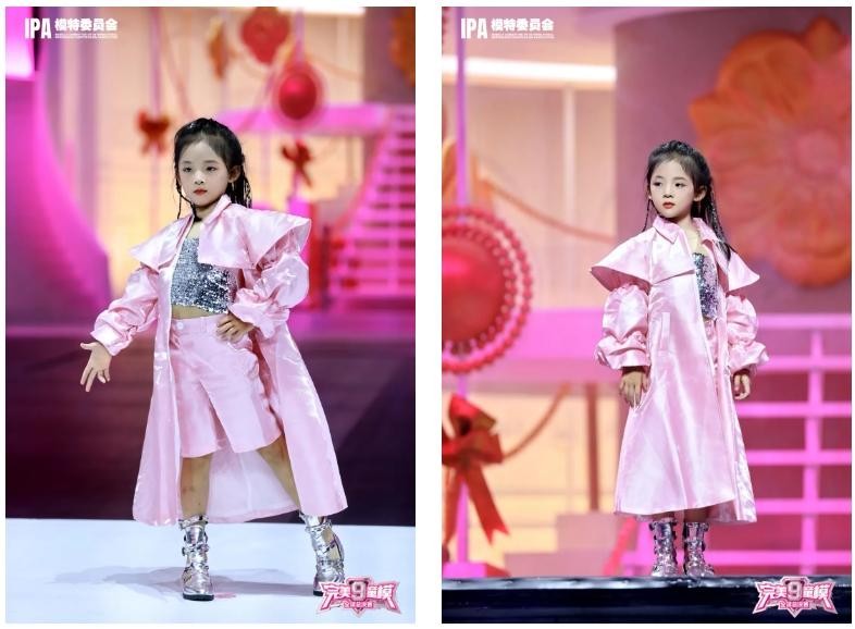 在开幕式上,王思懿 身着一套别具一格的粉色系穿搭。长款的粉色风衣质感高级,面料泛着柔和的光泽,衣摆长短不一,增添了几分随性与俏皮;内搭银色亮片短上衣,下身搭配同色系短裤,脚上的银色短靴,造型独特,金属光泽与上衣相呼应,整体造型既甜美又充满未来感,仿佛是从梦幻时空里走来的时尚小精灵,为开幕式增添了一抹亮丽的色彩。她迈着轻快又稳健的步伐,每一步都透着十足的节奏感。一手叉腰,一手自然摆动,姿态有模有样,眼神明亮且坚定,散发着童真的魅力。在转身和定点造型时,动作干净利落,展现出良好的舞台掌控力,将这身时尚造型的魅力完美呈现,以灵动可爱又不失时尚范儿的表现,成功吸引了全场目光,成为开幕式上一道灵动的风景线。
