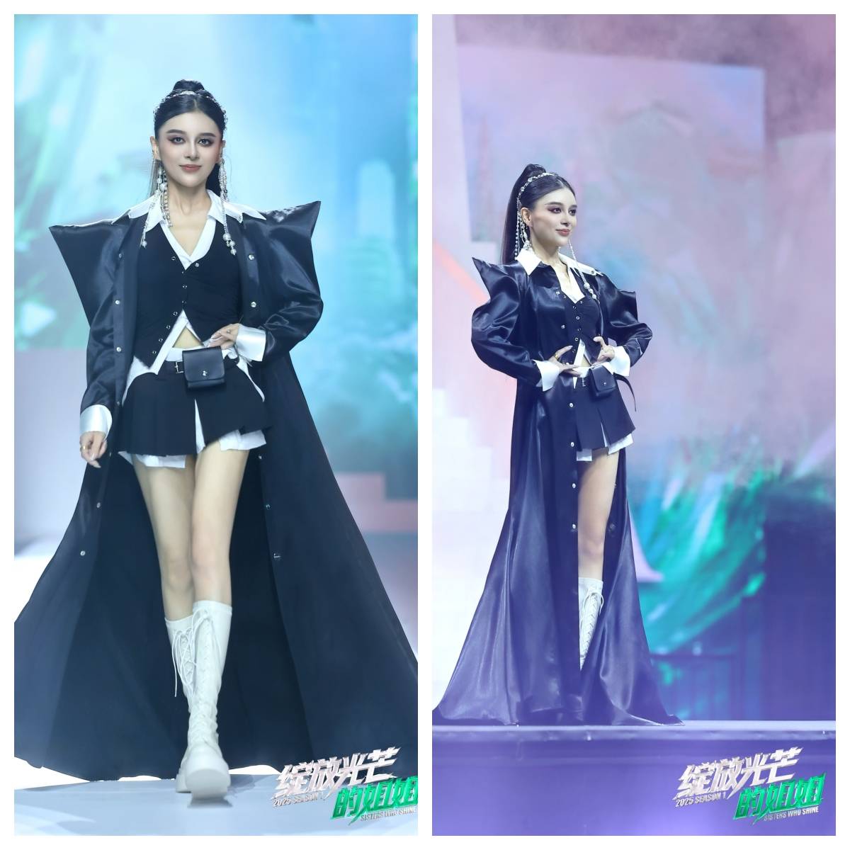 主题秀环节,姐姐身着黑色服装登场,肩部夸张的造型犹如展翅的羽翼,既增添了几分霸气,又不失时尚感。内搭的白色衬衣与黑色形成鲜明对比,凸显出层次感。她腰间别着黑色小包,脚蹬白色长靴,整体造型酷帅又不失优雅。在 T 台上,她时而眼神冷峻,时而微笑款款,用丰富的表情和流畅的台步,将主题的内涵展现得入木三分。她的每一个转身、每一次定格,都像是精心雕琢的艺术品,让在场的观众和评委为之倾倒。