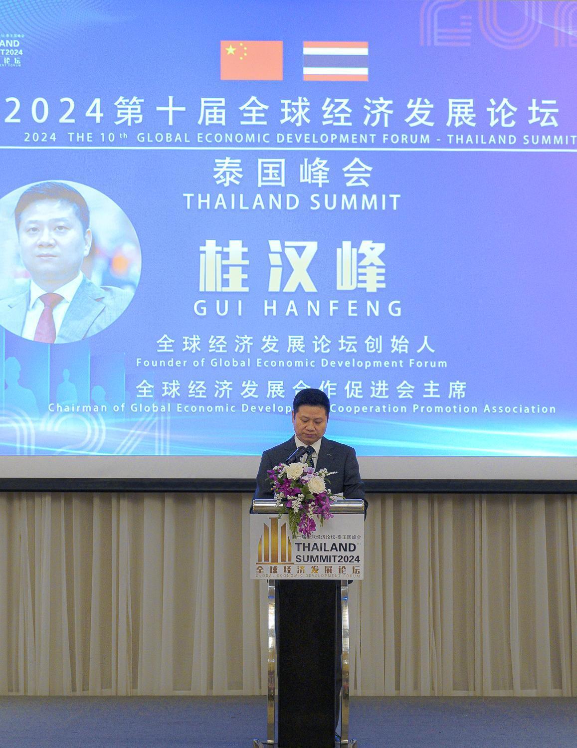 峰会开始,全球经济发展合作促进会主席、全球经济发展论坛创始人桂汉峰在致辞时表示泰国不仅是“一带一路”倡议的积极参与者,更是积极推动者。随着中泰两国在多个领域合作的持续深化,泰国迎来了重要的发展机遇,中泰命运共同体建设也步入了快车道,此次论坛的召开,不仅构筑了中泰企业家交流与合作的坚实桥梁,更成为推动中泰和东盟在文化、经贸、科技等产业的强劲动力。