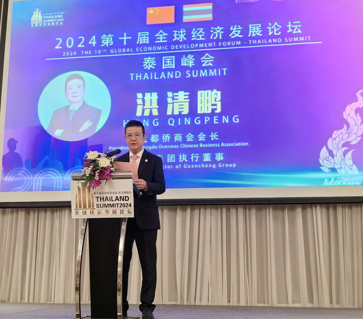 成都侨商协会会长洪清鹏大会发言说道,中泰即将迎来建交50周年,在这重要的历史时刻,“第十届全球经济发展论坛”的召开,为我们中泰企业家搭建了一个宝贵的学习交流合作平台,让我们以本次论坛为契机,乘着“一带一路”的东风,携手并进,以更加开放的心态、更加务实地行动,我们侨商会将发挥商会优势和自身优势,推动两地企业在贸易、投资、旅游、教育等领域的全面合作,共同书写中泰发展新篇章。