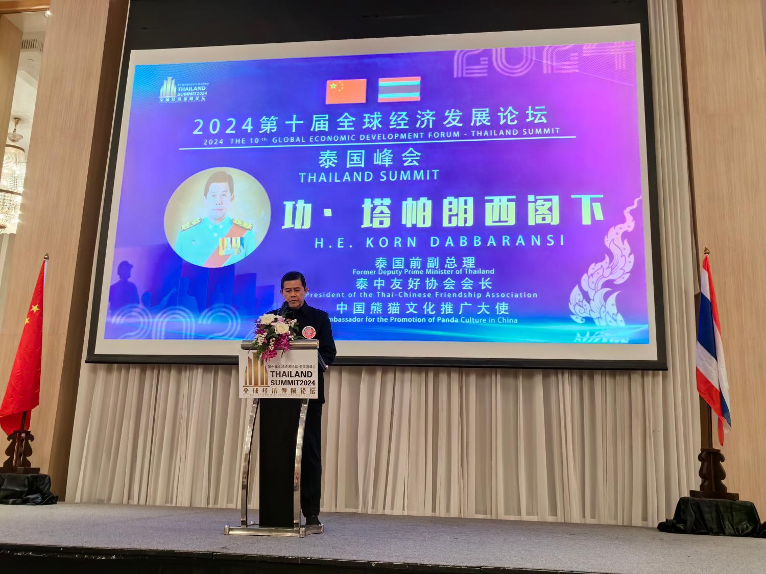 第十届全球经济发展论坛联席主席、泰国前副总理、泰中友好协会会长功·塔帕朗西阁下进行压轴演讲,他作为泰国前副总理,长期致力于推动泰中友好关系的发展,不仅在政治领域取得了显著成就,还积极参与国际事务,为推动全球经济发展与合作做出了积极贡献。在峰会上,功·塔帕朗西阁下发表了热情洋溢的致辞,表达了对中泰两国关系的美好祝愿,并期待两国在未来的合作中取得更多成果。功会长全场脱稿精彩演讲获得阵阵掌声,他呼吁永远“中泰一家亲”。